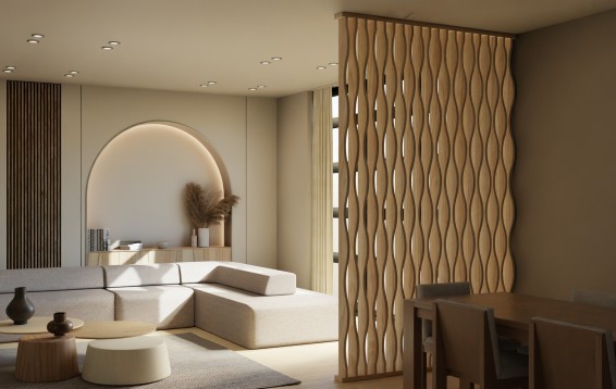 Panneaux et lames MDF rainurés/micro-perforés et ossatures pour applications murs/plafonds/cloisons/modules préfabriqués